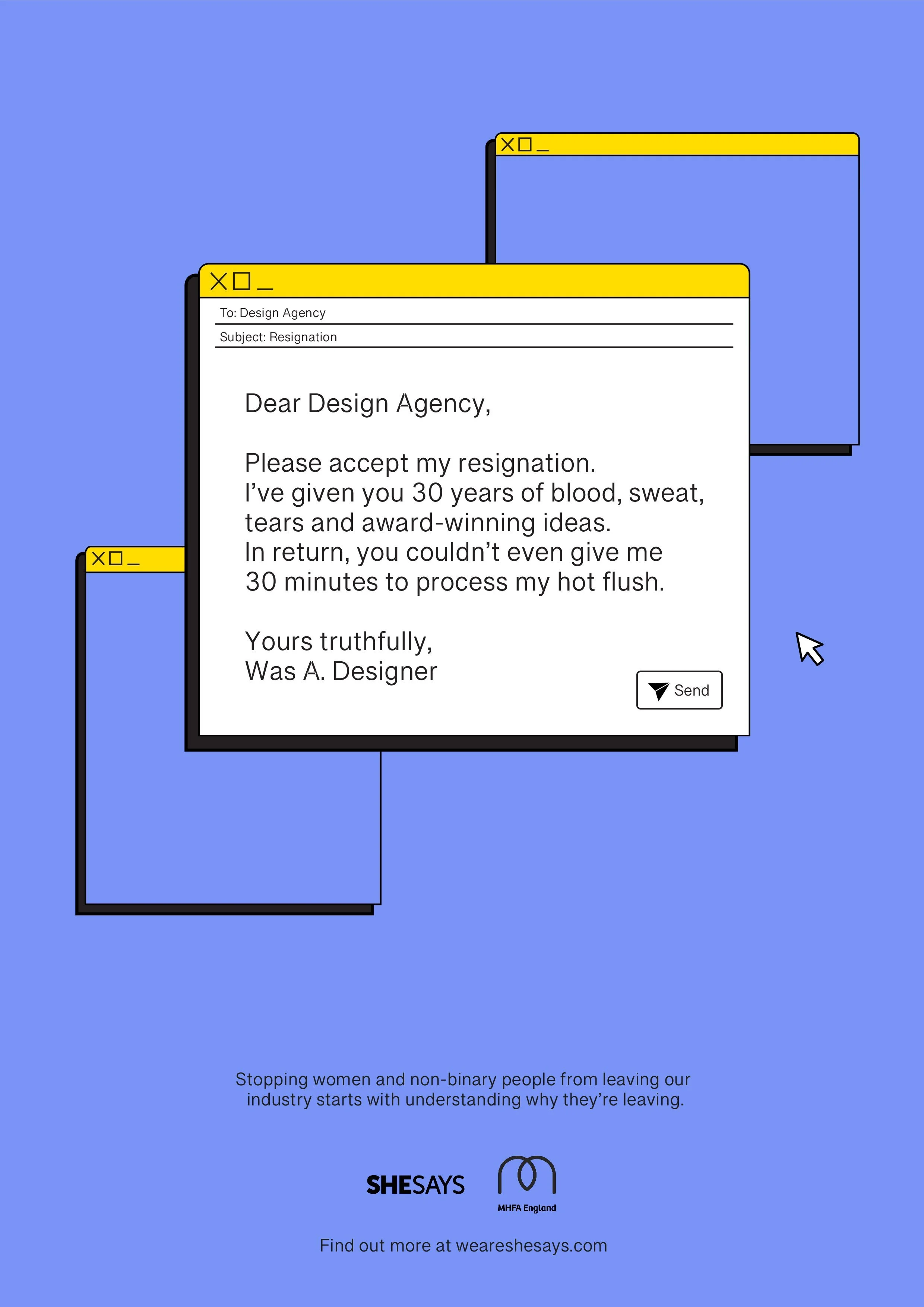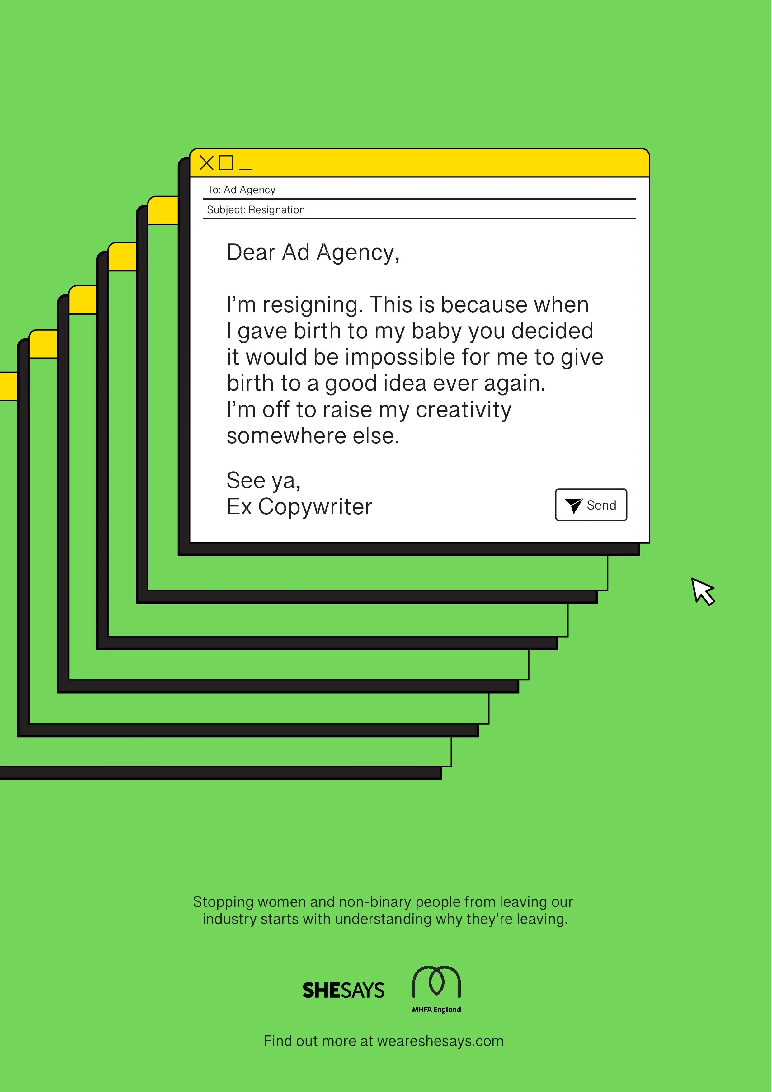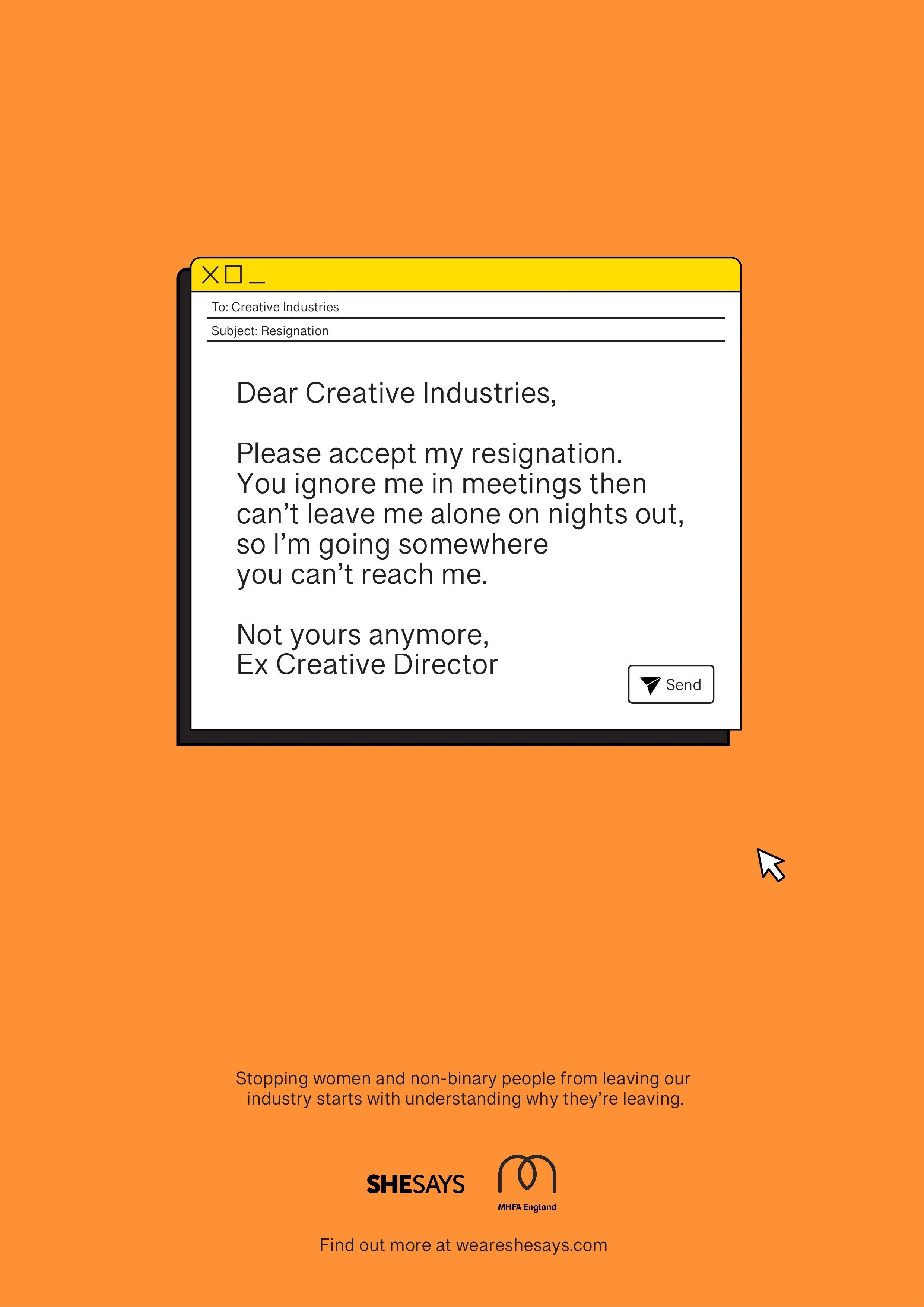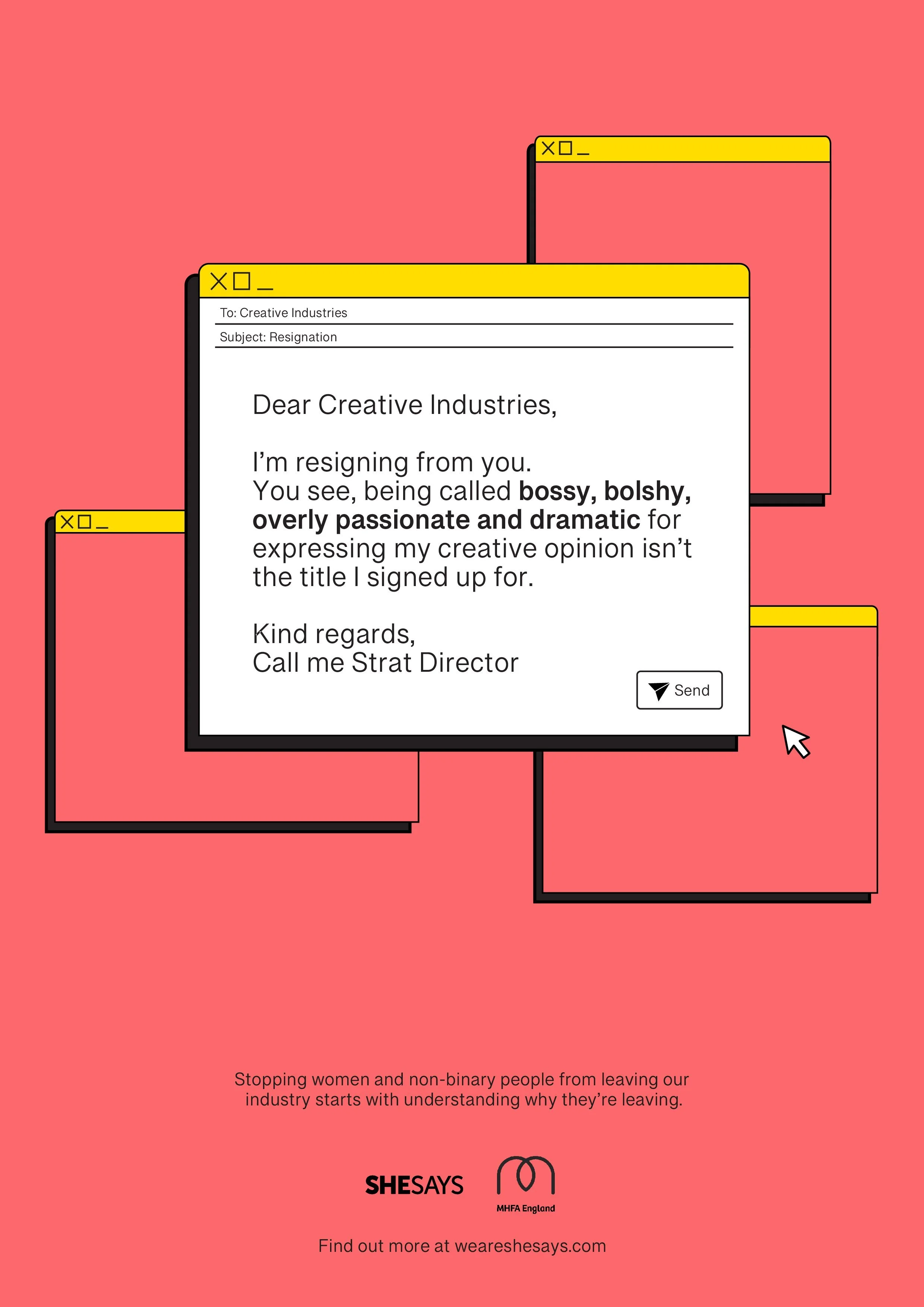 10% of women in creative industries, including advertising, left the industry in 2021. She Says put out a survey to shine a light on the real stories behind that statistic. The results were a damning account of our industry by the women who have left. Everything from sexual harassment, bullying, lack of work-life balance were highlighted amongst the hundreds of replies. The individual stories from the survey were emotive and powerful and unfortunately very relatable. So, for IWD we wrote the resignation letters that the women from our survey couldn’t in order to highlight the things that desperately need to change.